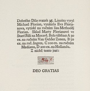 Vel. 4°, 24x16 cm. 68 číslovaných s., česky. Titulní strana tištěna v červené a černé barvě a obsahuje ručně kolorované linoryty. Měkká šitá vazba. Edice Dobrého díla svazek 96, linoryty vyryl a ručně koloroval Michal Florián, ze skladu Marty Florianové ve Staré Říši na Moravě. Bylo tištěno: A 30 ex. na ručním Van Gelder Zonen, B 50 ex. na ruč. Ingres, C 100 ex. na ručním Medianu, D 200 ex. na Hollandu. Tento výtisk má číslo 54 C. Na deskách obálky značeno sbírkovým razítkem "J. Kačer".