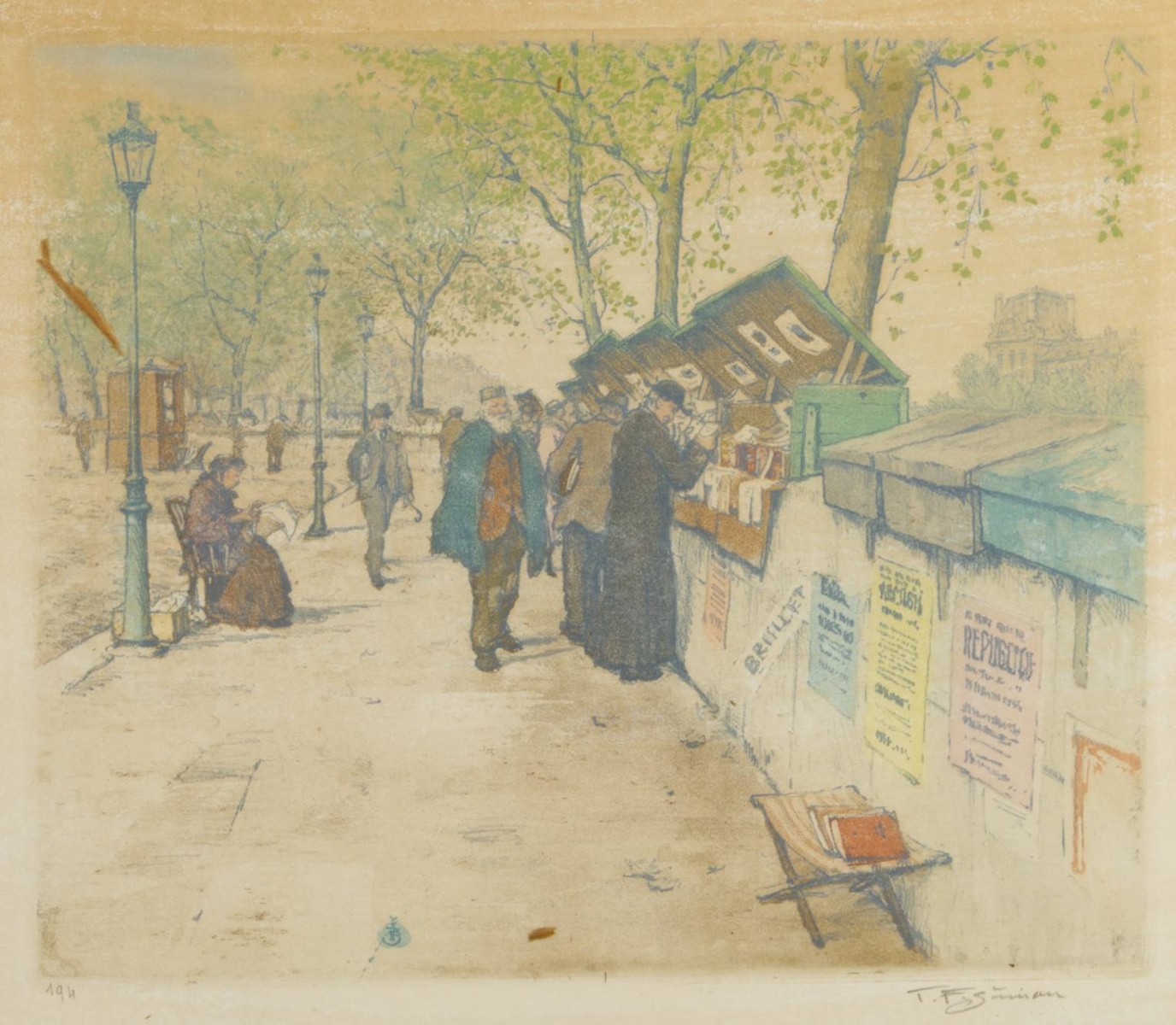 1924 Barevný lept na papíře "Zanders" 27x31,5 cm (39,5x44,5 cm), čísl. a sign. tužkou pod tiskovou plochou "194 T. Fr. Šimon". Značeno vlevo nahoře vodoznakem "NDERS", další dva vodoznaky vlevo dole. Rámováno, zaskleno. Skvrny v celé ploše listu. František Tavík Šimon - pražský malíř a grafik. Studoval na pražské akademii u prof. Pirnera. V téže době absolvoval balkánský studijní pobyt. Následovala řada dalších cest po Evropě, mocně jej ovlivnila především Paříž (v oblasti grafiky). Vydal se dokonce na cestu kolem světa (navštívil mj. Japonsko, Čínu, Indii, Cejlon).