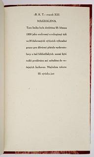 Magdalena, vel. 12°, 21x13 cm. Titulní strana tištěna v červené a černé barvě, česky, 30 číslovaných s. Dobová poloplátěná převazba. R. K. T. svazek XIII. Tato kniha byla dotištěna 25. března 1930 jako soukromý a rukopisný tisk ve 30 číslovaných výtiscích výhradně pouze pro přátele vydavatelovy z řad bibliofilských; nesmí býti tudíž prodávána ani zařazena do veřejných knihoven. Tento výtisk nese číslo 22. Soubor erotické či eroticko-naturalistické poezie. Autor neuveden, pravděpodobně se jedná o někoho z okruhu edice 69 či edice Lotos (Toyen, Štyrský, Brouk, Bruner, Teige...)
