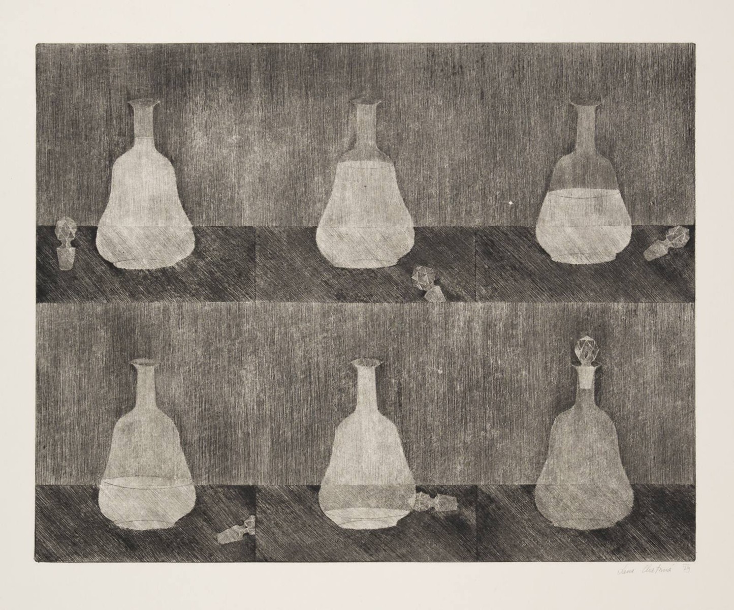 II. 51x39 cm (70x47 cm). Čísl. tužkou vlevo dole pod tiskovou plochou "2/5", sign. a dat. vpravo dole "Dana Chatrná 80". Pokrčené okraje, drobné vrypy mimo tiskovou plochu.