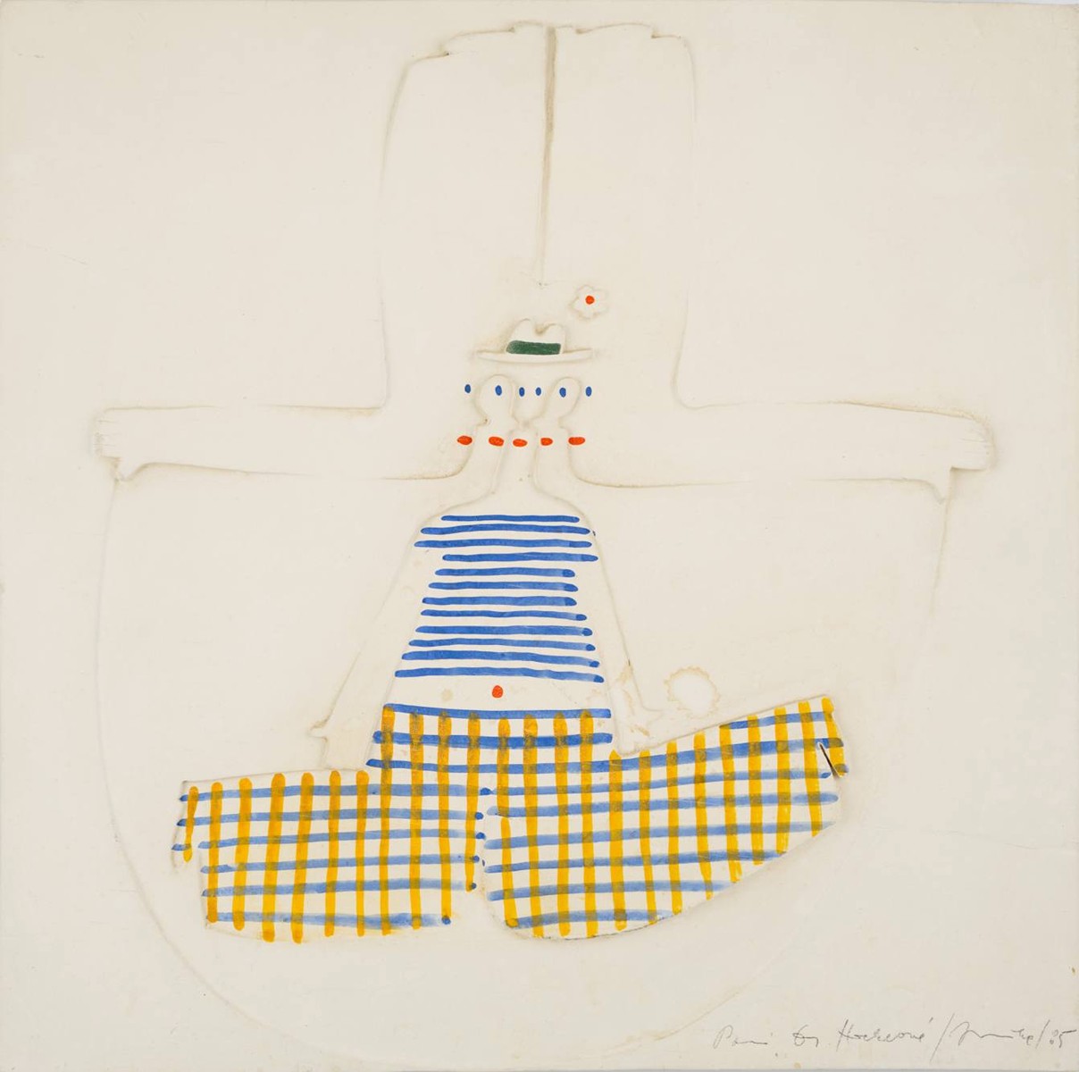 1985 Reliéf na překližce, 35x35 cm. Recto vpravo dole tužkou autorovo věnování, sign. a datace "Paní Dr. Hockeyové / Juračka / 85".