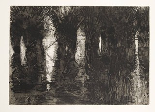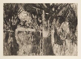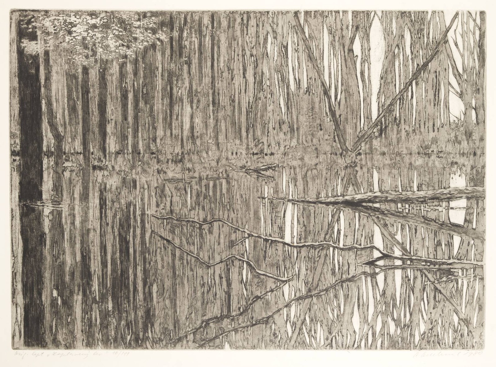 Zaplavený les: 36x50 cm (42x57 cm). Tužkou pod tiskovou plochou technika, název díla, čísl. "Orig. lept Zaplavený les 10/199", vpravo dole sign. a dat. "A. Odehnal 1980".