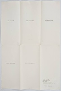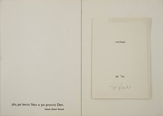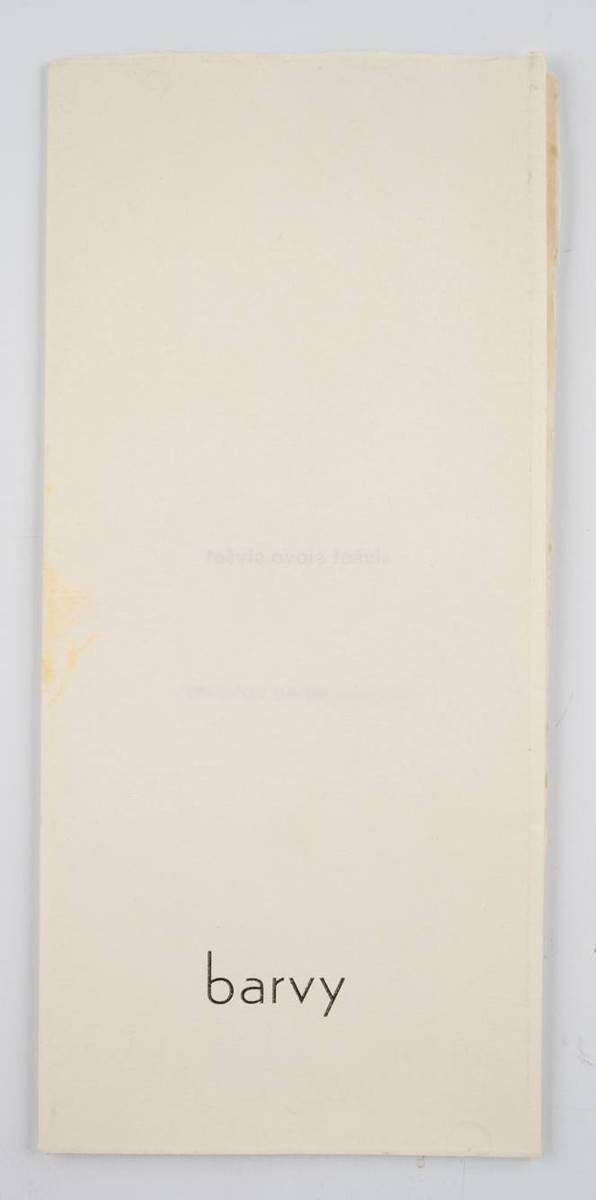 Dvě pozvánky k výstavě vizuálních textů Jiřího Valocha (20.10. - 28.11.1990) na ručně sbíraném papíře s vodoznakem z Losin: Vel. 2°, 42x29 cm, vydal Dům umění v Opavě. Papír přeložen 1x horizontálně a 2x vertikálně. Na obou exemplářích drobné skvrny.