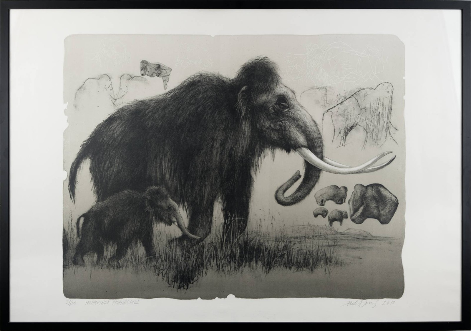 Barevná litografie na papíře, 59x75 cm (73x103 cm). Čísl. a název díla tužkou vlevo dole pod tiskovou plochou "21/30 Mammuthus primigenius", sign. a dat. vpravo dole "Pavel Dvorský 2013".