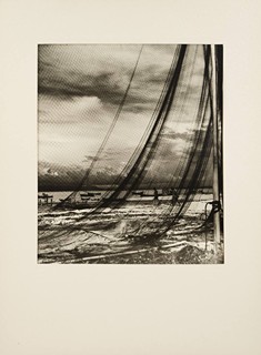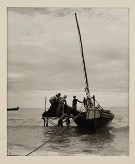 Unloading the net: verso značeno autorským razítkem, razítkem z výstavy "Exhibition of Marine Photography 1953", přípis autora tužkou název fotografie a popis činnosti na fotografii.