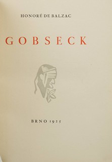 Honoré de Balzac: Gobseck. Vel. 8°, 18,6x13,5 cm. 82 číslovaných s., česky, přeložil Jaroslav Zaorálek. Titulní strana tištěna v černé a červené barvě. 4 dvojbarevnými dřevoryty a titulní vinětou vyzdobil J. Konůpek. Pevná polokožená vazba Karla Dudeška: hřbet se 4 dvojitými vazy a zlatými typy, pergamenové rohy, desky potaženy tlačeným papírem, zlacená horní ořízka. Obálka není vevázána. Vydal Arno Sáňka v Brně v květnu 1925 jako 4. sv. knihovny "200" v nákladu 200 ručně číslovaných výtisků, z toto prvních 24 na pravém japanu a 176 na Zandersově ručním papíře, tento exemplář nese č. 197. Velmi dobrý stav.