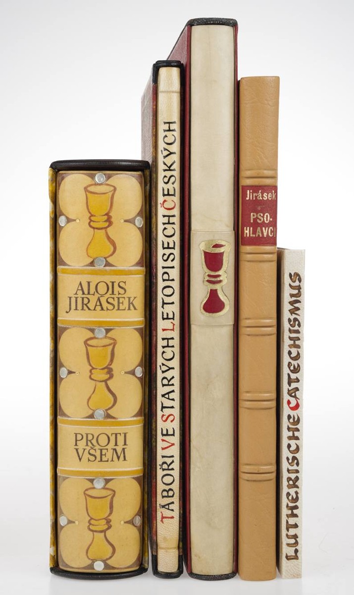 A. Jirásek: Proti všem. Vel. 4°, 22,7x17,9 cm. 681 číslovaných s., česky. Titulní strana tištěna v černé barvě. Ilustroval Vlastimil Rada. Pevná polopergamenová vazba: hřbet s kresbou a titulem, aplikace, desky potaženy mramorovaným papírem, barevný kapitálek, zlacená horní ořízka, na zadním přídeští značeno kulatým razítkem s dudkem "K DUDEŠEK", kartonové pouzdro potaženo autorským papírem. Vydalo nakladatelství Šolc a Šimáček v Praze r. 1939. První ilustrované vydání. Velmi dobrý stav.