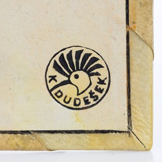 František Palacký: Hrad Kozí, Sezimovo Ústí, Tábor a táboři ve starých letopisech českých. Z prvního vydání historiografa království českého, Františka Palackého, r. 1829. Vel. 4°, 28,8x19,9 cm. 35 čísl. s., česky. Vybral a doslov napsal Ph. Dr. František Kroupa. Titul. dvoustrana i text tištěn v černé a červené barvě. Ilustroval Alois Moravec. Pevná polopergamenová vazba: hřbet z bílého pergamenu, kreslený dvojbarevný titul, desky potaženy autorským papírem, vytlačená figura husitského bojovníka z červené kůže, zlacení, kapitálek, zlacená horní ořízka, na zadním přídeští značeno nalepeným kulatým razítkem "KD", kartonové pouzdro potažené autorským papírem. Na zadním vakátu značeno kulatým razítkem s dudkem "K DUDEŠEK" a signováno: "Einband gestaltet E. K. Dudešek". Obálka vevázána na konci knihy. Vydáno v jubilejním roce dvacátého výročí Československé republiky u příležitosti zájezdu Spolku českých bibliofilů do Tábora 7. a 8. května L. P. 1938 v nákladu 120 číslovaných výtisků na papíře Pannekoek-Holland, tento exemplář nese č. 28. Ručně kolorováno a na předním vakátu akvarelové ex-libris K. Dudeška od V. Moravce. Velmi dobrý stav. Další exemplář je uložen ve sbírkách Moravské galerie v Brně, inv. č. BF 728.