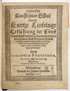 Johann Förster Jr.: Lutherische Catechismus Schul. Das ist kurtze Einfeltige Erklährung der Fünff Hauptstück unsers lieben Lutherischen Catechismi. Vel. 8°, 18,5x14,8 cm. 88 číslovaných s., německy. Titulní strana tištěna v černé barvě. Záhlaví, viněta, iniciály. Pevná polopergamenová vazba, pergamenové rohy, desky potaženy autorským papírem, barevný kapitálek. Na začátku knihy vevázán list s dobovými rukopisnými poznámkami. Vytiskl Johann Gormann ve Wittenbergu roku 1616. Knižní blok celkově v dobrém stavu, okraje listů restaurovány, v přední části drobné požerky od hmyzu.