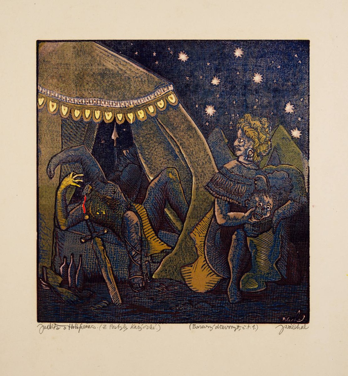 Barevný dřevoryt na papíře 25x24 cm (42x33,5 cm), recto tužkou vpravo dole pod tiskovou plochou podpis autora "J. Váchal", vlevo dole název díla "Judita a Holofernes (Z Postyly Kacířské)" a pozn. "(Barevný dřevoryt, č. t. 1.)", sign. vpravo dole v tisku "J. Váchal". Velmi vzácný exemplář z vrcholného Váchalova období. Tento motiv Váchal otiskl jako součást knihy Koruna bludařstva to jest Postyla kacířská. Jak Váchal sám uvádí ve vydavatelských poznámkách, kniha tato byla vytisknuta v 16 exemplářích a dále "Dřevoryty tyto kromě knihy otištěny byly ještě třikráte na zvláštní list a desky během práce ničeny", toto je tedy jeden z celkového počtu tří volných listů, které Váchal zhotovil.
