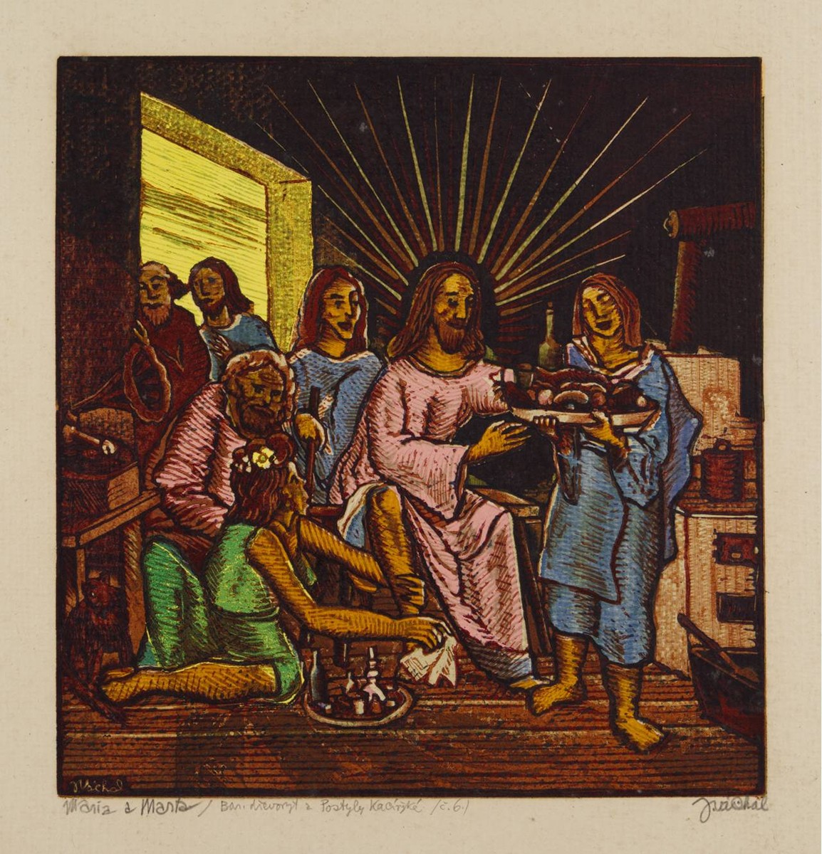 Barevný dřevoryt na ručně sbíraném papíře 25x24 cm (42x34 cm), recto tužkou vpravo dole pod tiskovou plochou podpis autora "J. Váchal", uprostřed dole název díla "Maria a Marta" a vlevo dole pozn. "Barevný dřevoryt z Postyly Kacířské/č. 6", sign. vlevo dole v tisku "J. Váchal". Velmi vzácný exemplář z vrcholného Váchalova období. Tento motiv Váchal otiskl jako součást knihy Koruna bludařstva to jest Postyla kacířská. Jak Váchal sám uvádí ve vydavatelských poznámkách, kniha tato byla vytisknuta v 16 exemplářích a dále "Dřevoryty tyto kromě knihy otištěny byly ještě třikráte na zvláštní list a desky během práce ničeny", toto je tedy jeden z celkového počtu tří volných listů, které Váchal zhotovil.