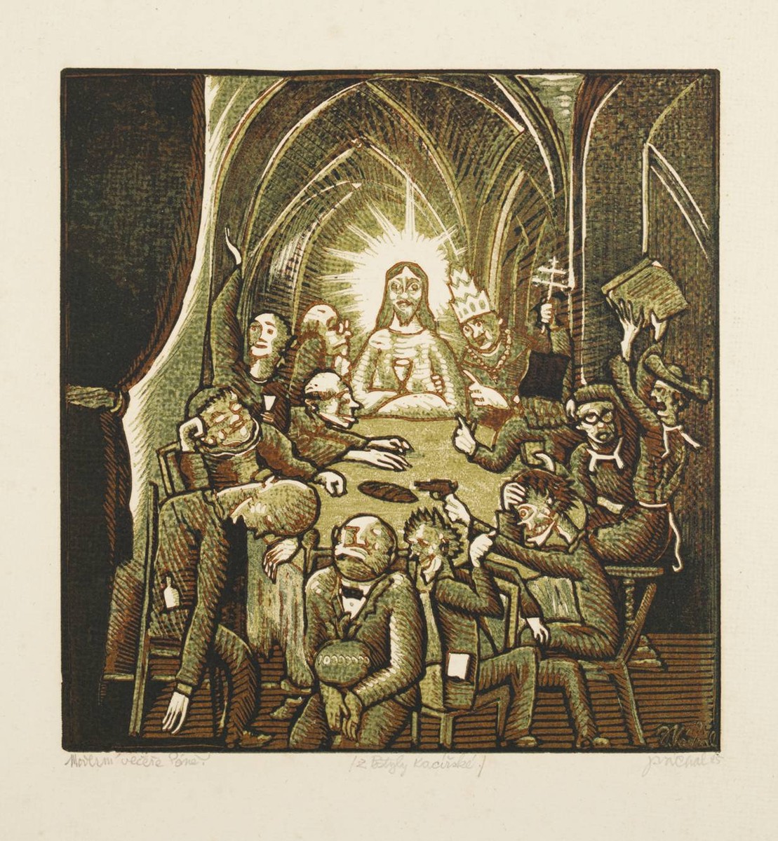 Barevný dřevoryt na ručně sbíraném papíře 25x24 cm (43x34 cm), recto tužkou vpravo dole pod tiskovou plochou podpis autora a datace "J. Váchal 25", uprostřed dole název díla "Moderní večeře Páně" a vlevo dole pozn. "/Z Postyly Kacířské/", sign. vpravo dole v tisku "J. Váchal". Velmi vzácný exemplář z vrcholného Váchalova období. Tento motiv Váchal otiskl jako součást knihy Koruna bludařstva to jest Postyla kacířská. Jak Váchal sám uvádí ve vydavatelských poznámkách, kniha tato byla vytisknuta v 16 exemplářích a dále "Dřevoryty tyto kromě knihy otištěny byly ještě třikráte na zvláštní list a desky během práce ničeny", toto je tedy jeden z celkového počtu tří volných listů, které Váchal zhotovil.