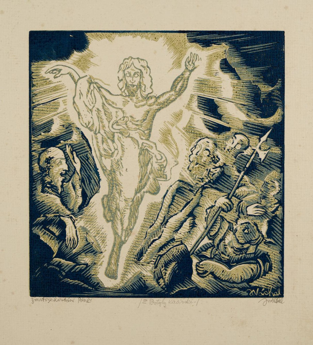 Barevný dřevoryt na ručně sbíraném papíře 25x24 cm (43x34 cm), recto tužkou vpravo dole pod tiskovou plochou podpis autora "J. Váchal", uprostřed dole název díla "Zmrtvýchvstání Páně" a vlevo dole pozn. "/Z Postyly Kacířské/", sign. vpravo dole v tisku "J. Váchal". Velmi vzácný exemplář z vrcholného Váchalova období. Tento motiv Váchal otiskl jako součást knihy Koruna bludařstva to jest Postyla kacířská. Jak Váchal sám uvádí ve vydavatelských poznámkách, kniha tato byla vytisknuta v 16 exemplářích a dále "Dřevoryty tyto kromě knihy otištěny byly ještě třikráte na zvláštní list a desky během práce ničeny", toto je tedy jeden z celkového počtu tří volných listů, které Váchal zhotovil.
