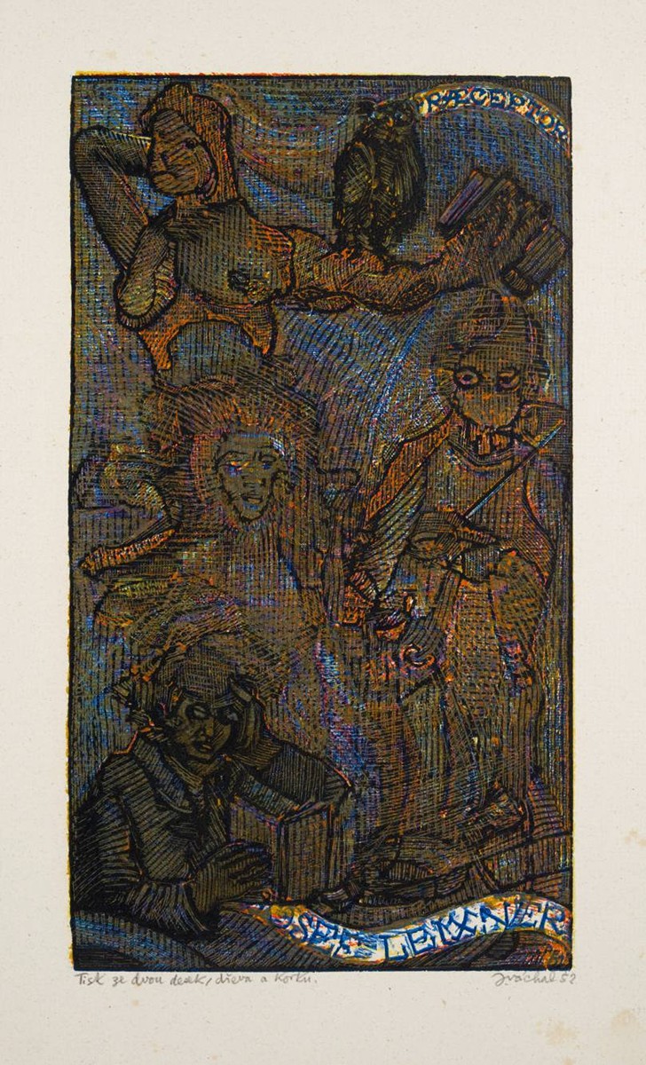 1952 Barevný dřevoryt do korku na papíře 34,5x19 cm (42,5x26,5 cm), recto tužkou vlevo dole "Tisk ze dvou desek, dřeva a korku.", vpravo dole sign. a dat. "J. Váchal 52", sign. a dat. vpravo dole v tisku "J.V.52". Skvrnitý papír. Josef Váchal - český malíř, grafik, ilustrátor, sochař, řezbář, spisovatel a básník. Jeho tvorba byla ovlivněna expresionismem a prvky symbolismu, naturalismu a secese. V roce 1969 oceněn titulem Zasloužilý umělec.