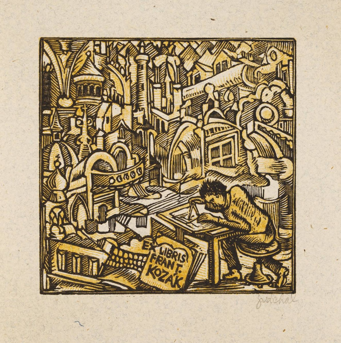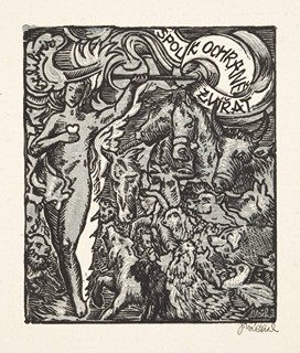 1925 Čtveřice dřevorytů na papíře Spol. k ochraně zvířat, dvoubarevný dřevoryt na ručně sbíraném papíře, 12,5x10,5 cm (23x16 cm). Sign. v tisku vpravo dole "J. Váchal" a tužkou vpravo dole pod tiskovou plochou "J. Váchal". Verso značeno razítkem "A. Macková, Kollárova ul. 13". Paspartováno. Ex libris Václav Rudl, černobílý dřevoryt,10x10 cm (23x15 cm). Sign. v tisku monogramem "JV", sign. tužkou vpravo dole pod tiskovou plochou "J. Váchal". Verso v rozích adjustován na papír 33x23 cm, tužkou vpravo dole na něm datace "1925". Ex libris Frant. Kozák, dvoubarevný dřevoryt, 10x10 cm. Sign. tužkou vpravo dole pod tiskovou plochou "J. Váchal". Verso v rozích adjustován na papír 33x23 cm. Ex libris Josef Jiřička, dvoubarevný dřevoryt na průklepovém papíře, 12x8,5 cm (21x15 cm). Sign. monogramem tužkou vpravo dole pod tiskovou plochou "JV". Verso ve dvou rozích adjustován na papír 33x23 cm. Josef Váchal - český malíř, grafik, ilustrátor, sochař, řezbář, spisovatel a básník. Jeho tvorba byla ovlivněna expresionismem a prvky symbolismu, naturalismu a secese. V roce 1969 oceněn titulem Zasloužilý umělec.