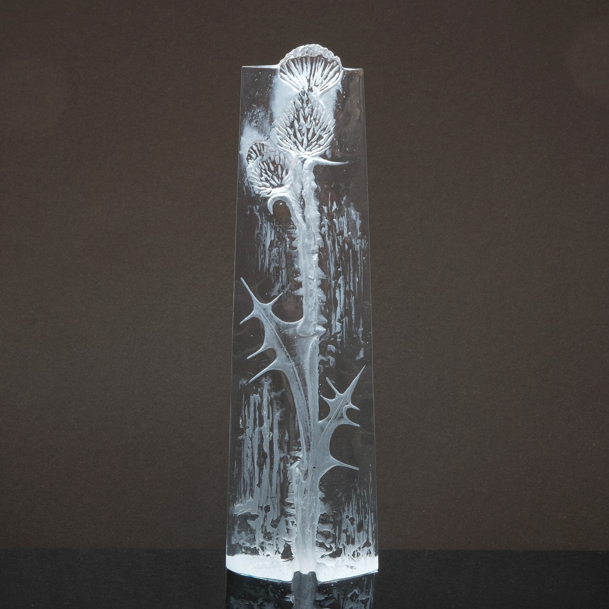 | technika | sklo čiré lehce namodralé, tavené ve formě, broušené a matované |