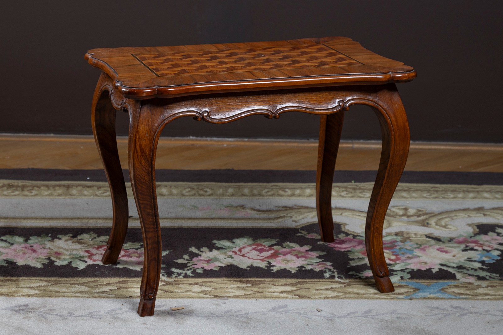 2. pol. 20. století, dřevo dubové, řezané, čtyři esovité nohy, deska dýhována ořechovou dýhou s geometrickou intarzií