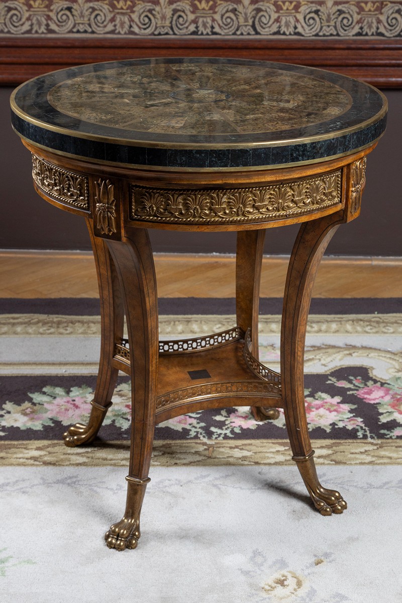 novodobé, dřevo, světle dýhované, intarzované linky, mosazné apliky, čtyři projmuté nohy s odkládací deskou, pod kruhovou deskou zlacené reliéfy, deska vykládaná barevnými mramory a mosazí