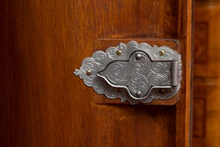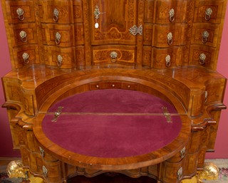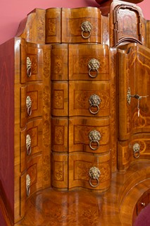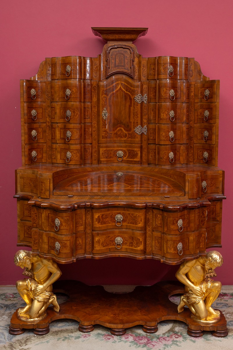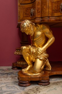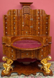kolem 2000, dřevo, ořechová dýha, bohatě intarzováno geometrickou intarzií, profilová základová deska, na ní dva dřevění řezaní a zlacení atlantové nesou dvouzásuvkovou komodu s profilovaným čelem a výklopnou deskou nad psací deskou, v horní části po stranách dva slouce drobných zásuvek, uprostřed skříňka, zhotovil Ladislav Pech, pořizovací cena cca 350.000 Kč