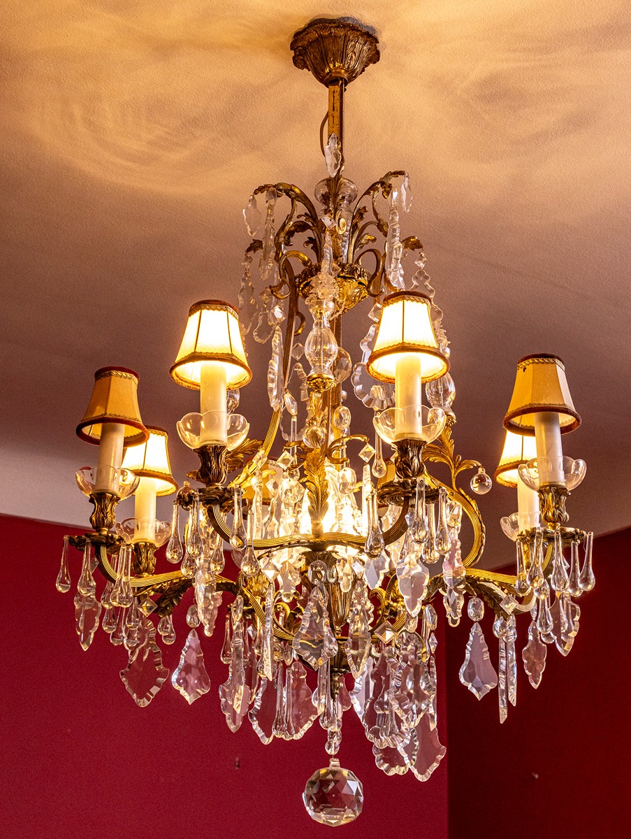 kolem 2000, Čechy, bronzová konstrukce, křišťálové ověsky, osvětlení v centrální části, osm ramen se svíčkami, elektrifikováno