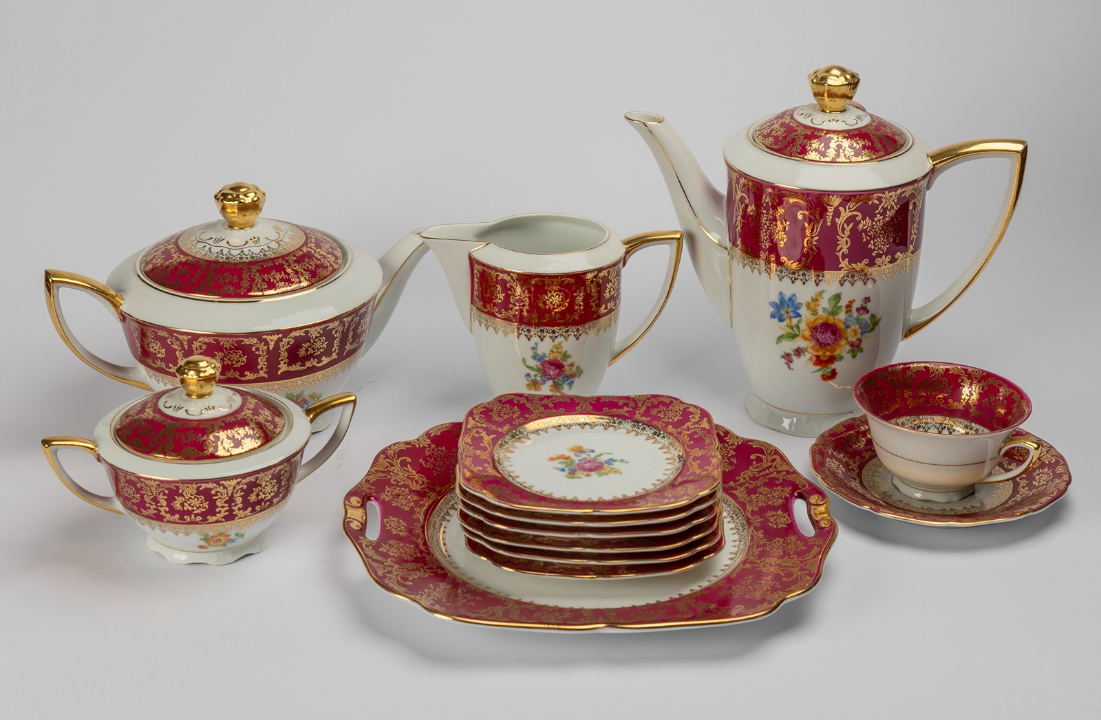 novodobé, porcelán, vínový fond, zlaceno, tištěné květy, obsahuje: konvici na čaj, konvici na kávu, šest koflíků s miskami na čaj, mísu a šest dezertních talířků, značeno Thun