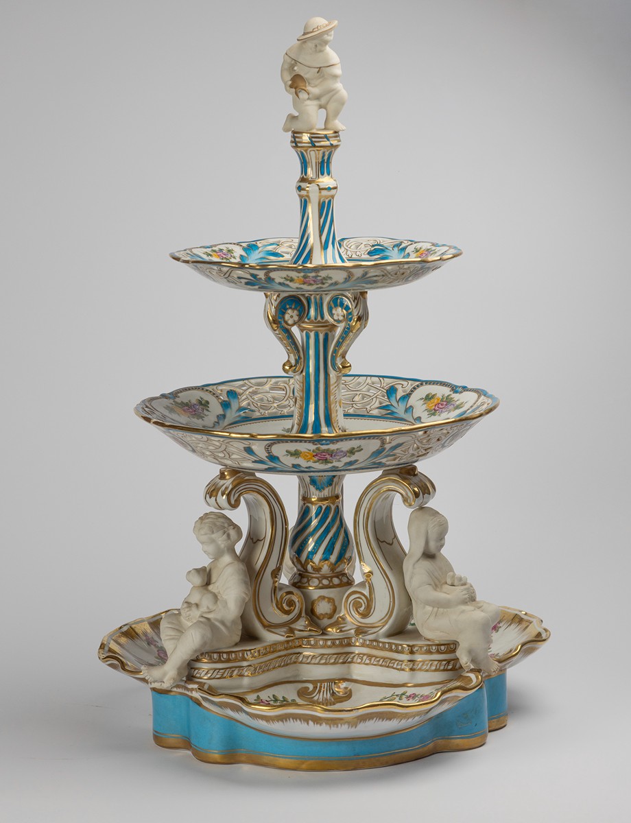 novodobé, porcelán, pestře malováno a zlaceno, ve spodní části tři misky tvaru mušle se třemi figurami, nad nimi dva menší talíře, na vrchu figurka chlapce, nepravá značka Míšně
