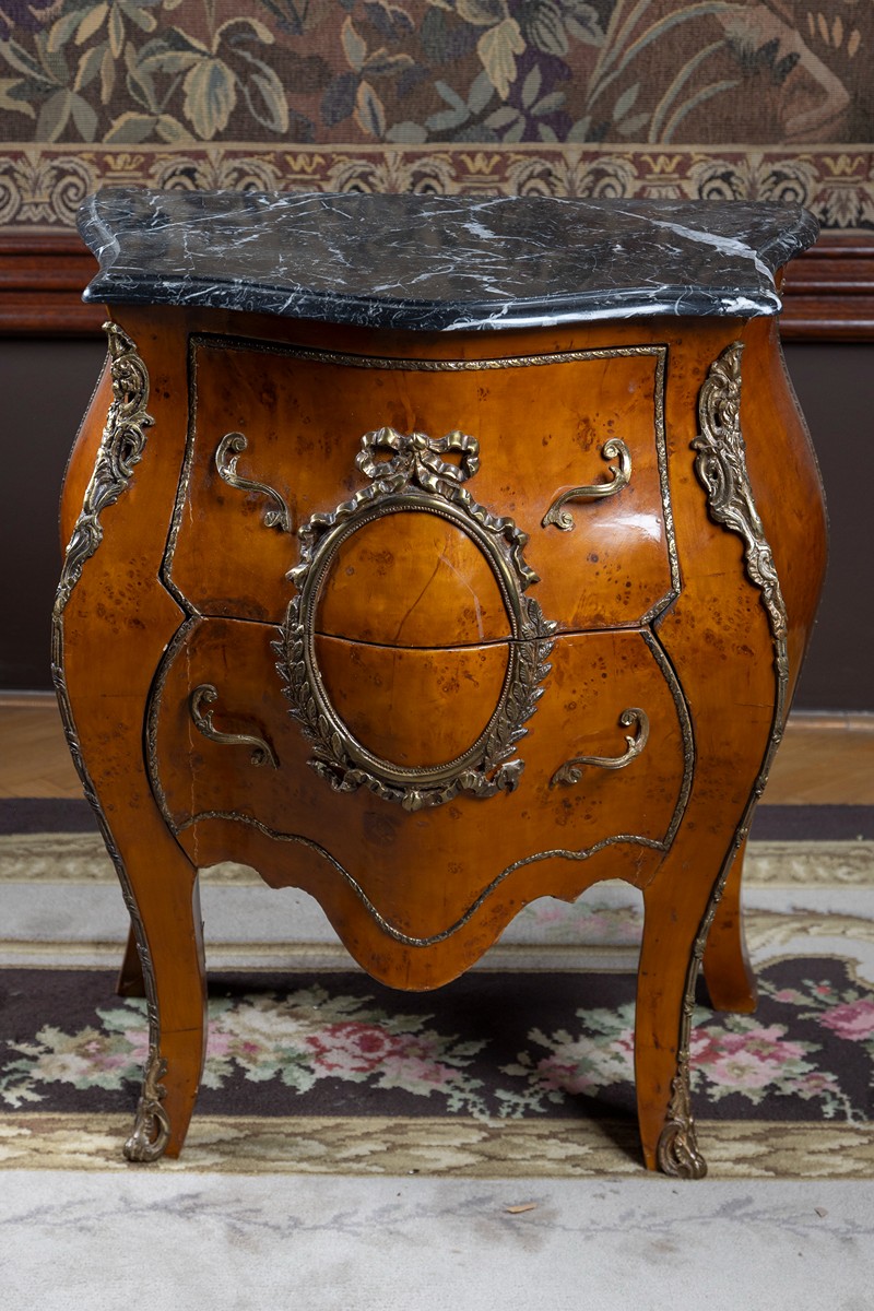novodobé, dřevo, kořenicové dýha, bronzové apliky, čtyři esovité nohy, dvě zásuvky, vrchní deska šedý žilkovaný mramor