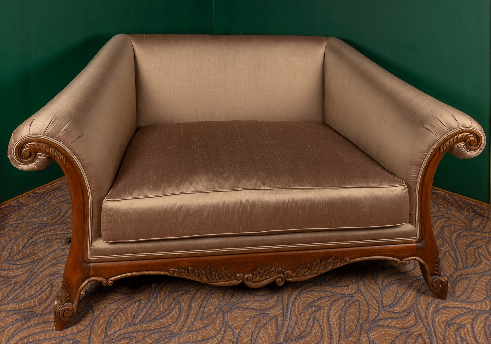20. století, dřevo, řezané, částečně zlacené, čalouněný sedák a opěradlo zlatým hedvábím