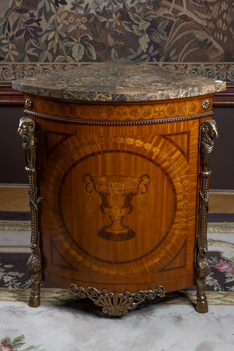 novodobé, dřevo, dýhováno exotickými dřevy, intarzovaný motiv vázy, v rozích dvě bronzové plastické nohy s motivy beraních hlav na vrchu, vrchní deska šedohnědý žilkovaný mramor