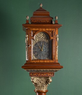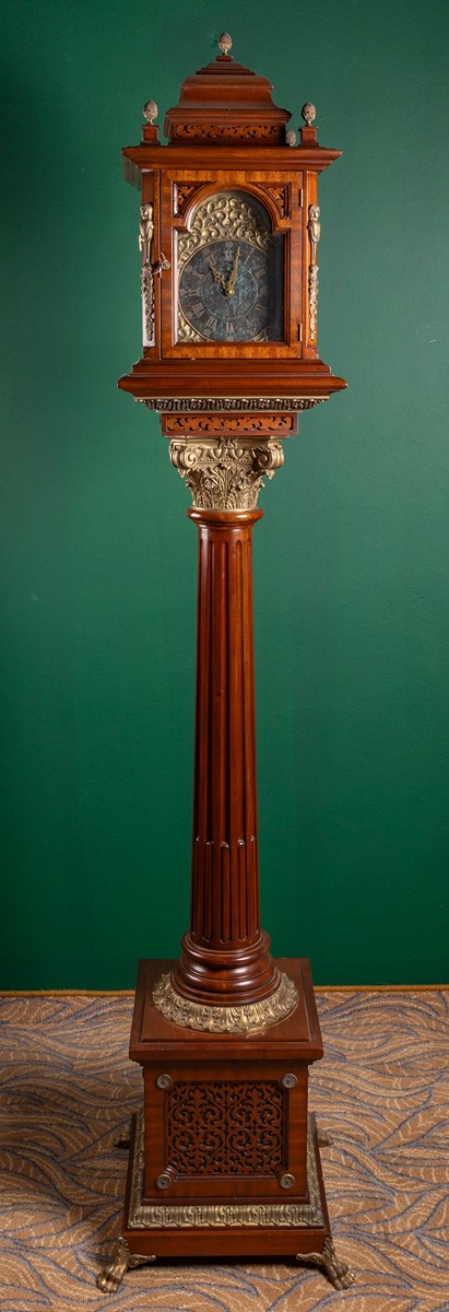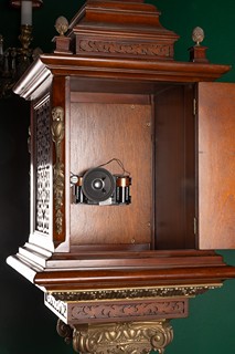 novodobé, dřevo, dýhované, řezané, mosazné apliky, ciferník mosazný, stroj elektrický