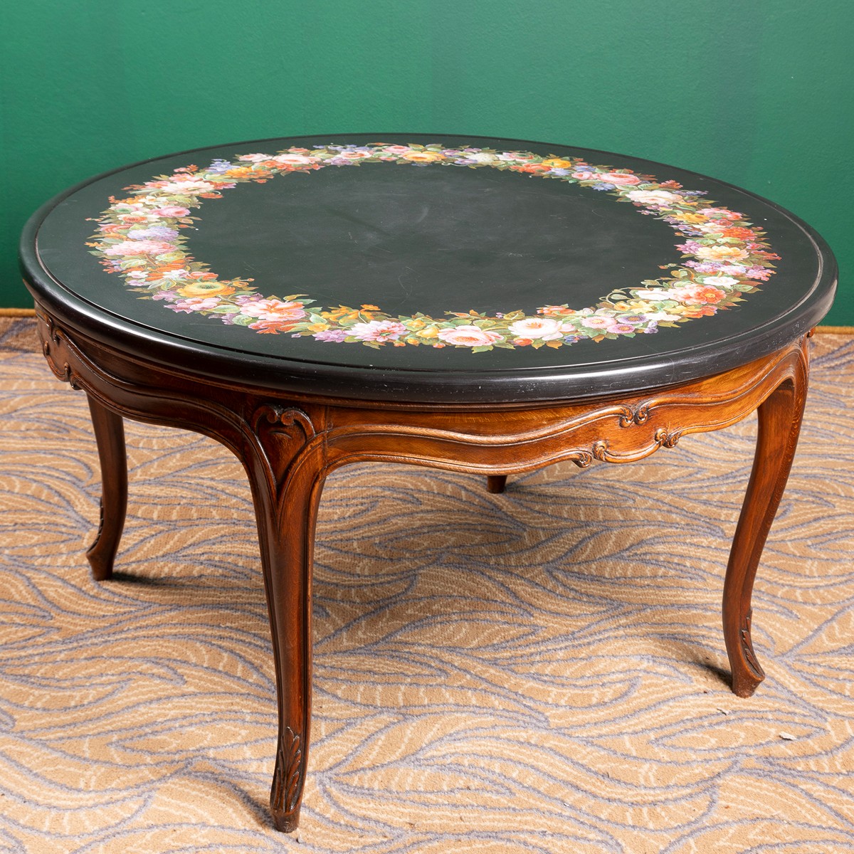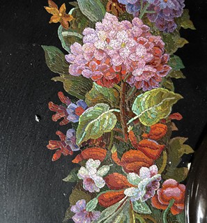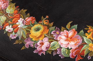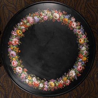 19. - 20. století, Itálie, deska z černého mramoru, květinový pás provedený technikou mikromozaiky, podnoží novodobé - dřevěné, řezané, čtyři esovité nohy