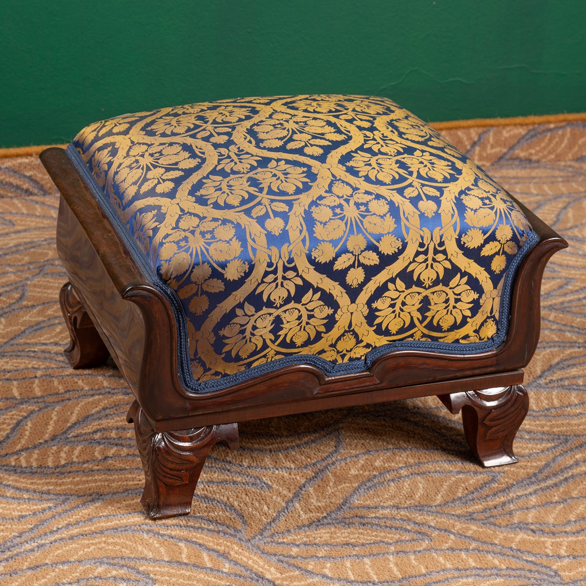 novodobé, mahagonové dřevo, řezané, čalouněné modrozlatým brokátem