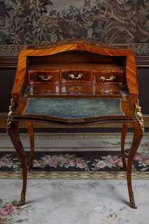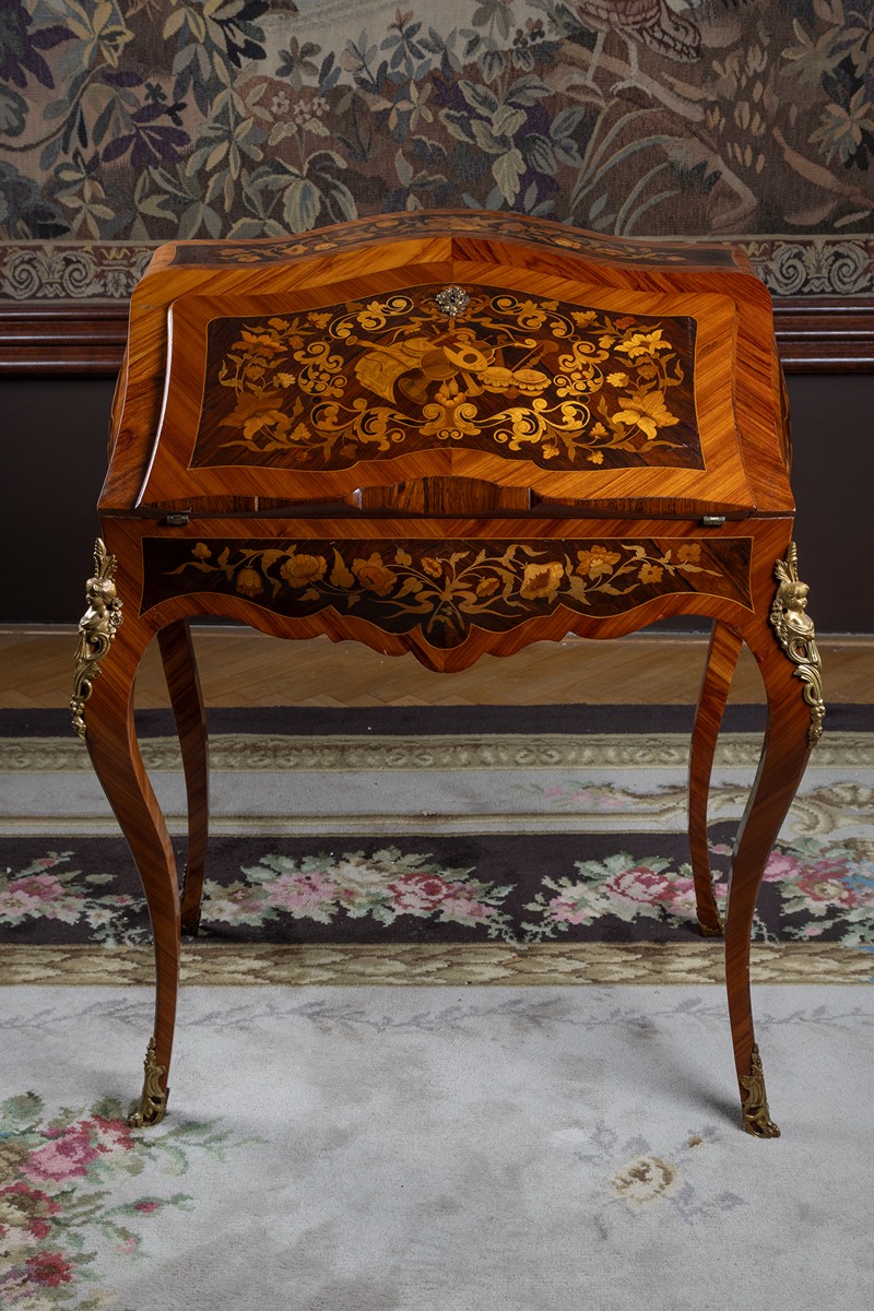 20. století, Francie?, dřevo, dýhováno růžovým dřevem, bohatě intarzováno, hudební motivy a rozviliny, čtyři esovité nohy, odklápěcí psací deska, uvnitř tři drobné zásuvky, nepatrně poškozené dýhy