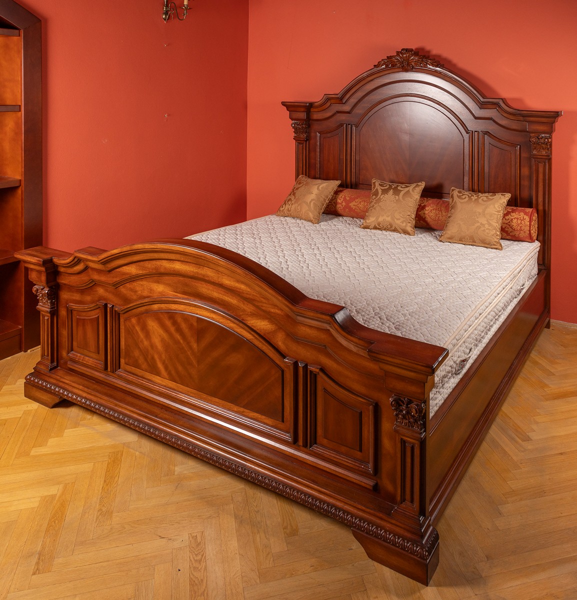 novodobé, dřevo, řezané, částečně dýhované mahagonem, po stranách řezané pilastry, vysoké čelo