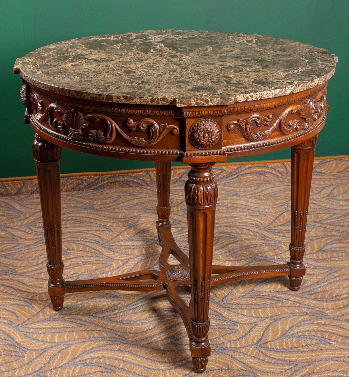 novodobé, dřevo, řezané, čtyři nohy spojené trnoží, lub stolu zdoben rozvilinami, deska z šedého žilkovaného mramoru