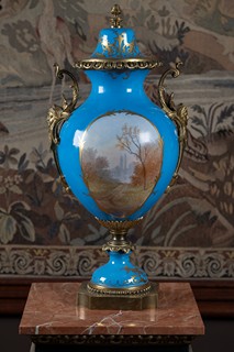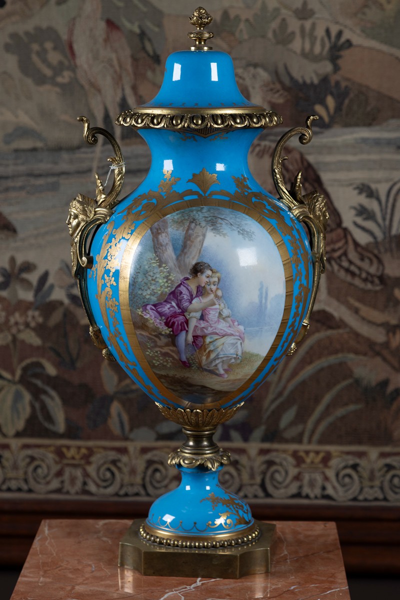 novodobé, Francie?, porcelán, světle modrý fond, kartuše s pestrou malbou krajiny, bronzová ucha a montáž, víko