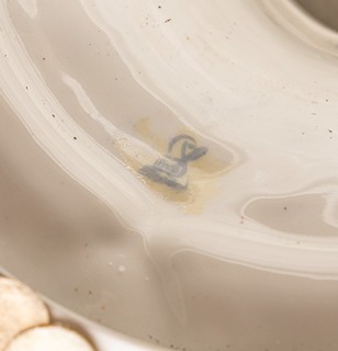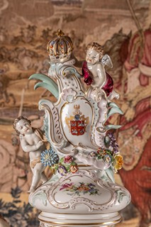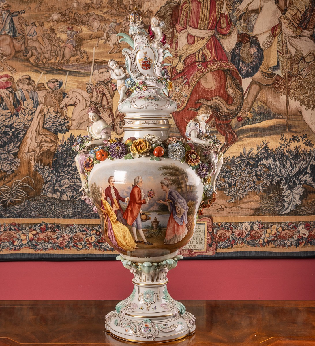 2. pol 20. století, Drážďany, porcelán, pestře malovaný motiv galantní společnosti, plastické motivy květů, dvě sedící dívčí figury s květy, víko s motivem kartuše s erbem a dvěma andílky, zhotoveno podle Míšeňské předlohy, značeno Drážďany