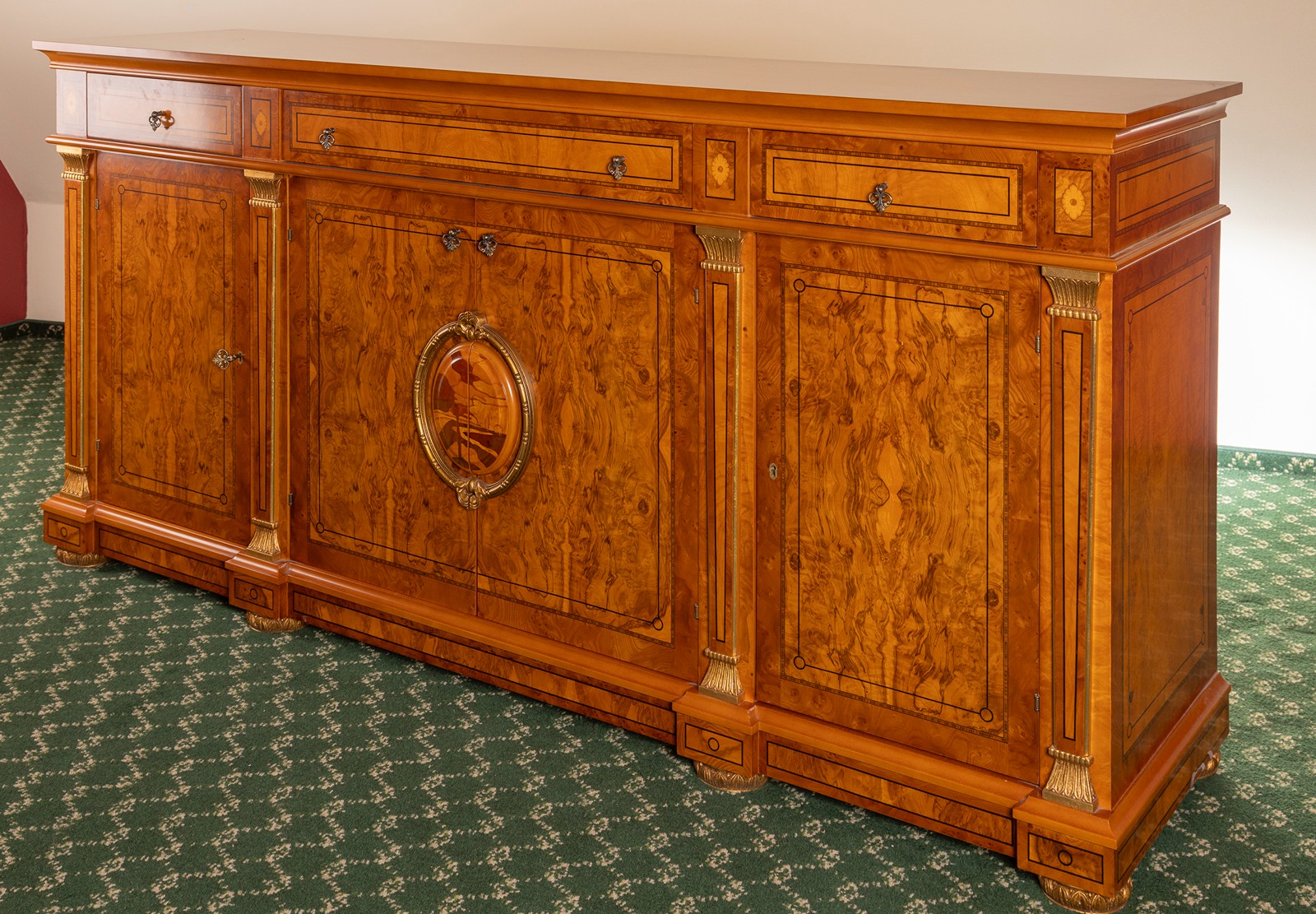 novodobé, dřevo, dýhováno exotickými dřevy, intarzováno, ve spodní části čtyři skříňky, pod deskou zásuvky, bronzové apliky, uprostřed kruhový medailon