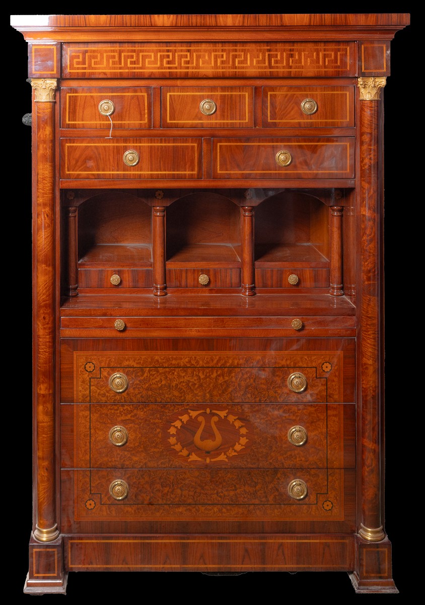 novodobé, dřevo, dýhováno mahagonem a kořenicí, intarzováno, po stranách polosloupky se zlacenými bronzovými hlavicemi, ve spodní části tři zásuvky, výsuvná psací deska, v horní části drobné zásuvky, intarzovaný motiv meandru a lyry