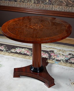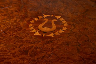 novodobé, dřevo, dýhováno mahagonem a kořenicí, centrální noha na trojboké základně, uprostřed desky intarzovaná lyra