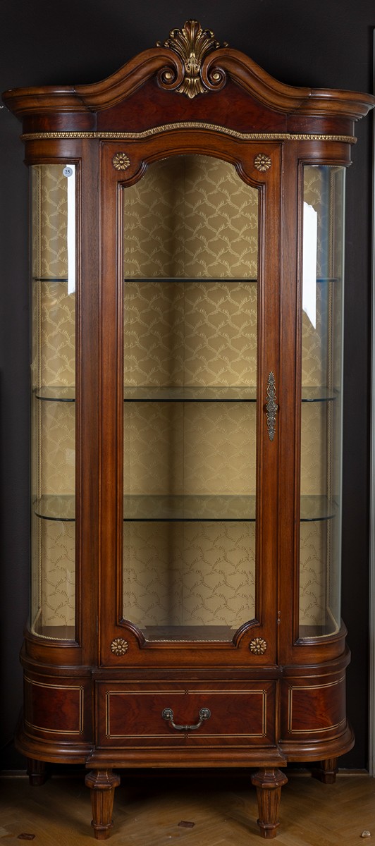 novodobé, dřevo, dýhované, řezaná římsa, částečně zlaceno, zaoblené prosklené boky, skleněné police