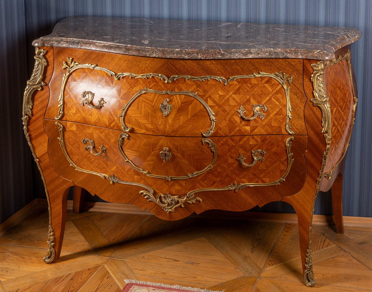 1. pol. 20. století, Francie, ve stylu Francois Linke, dřevo, ahagonová dýha, intarzováno exotickými dýhami, čtyři projmuté nožky, dvě zásuvky bohatě zdobené bronzovými aplikami, vrchní deska z béžového žilkovaného mramoru
