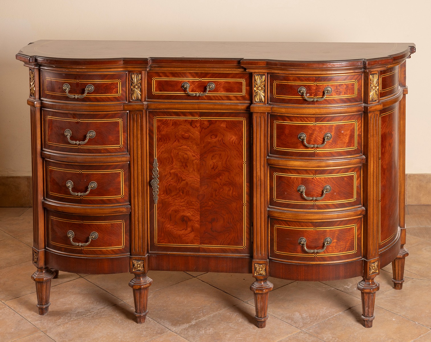 novodobé, dřevo, dýhováno exotickými dřevy, intarzovaná linka, po stranách zásuvky, uprostřed skříňka, profilovaná horní deska