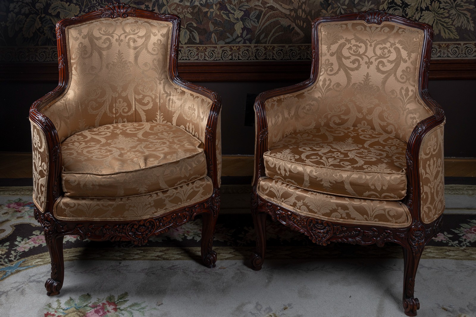 novodobé, dřevo, řezané, tmavě mořené, čtyři esovité nohy, čalouněný sedák a opěradlo zlatým brokátem