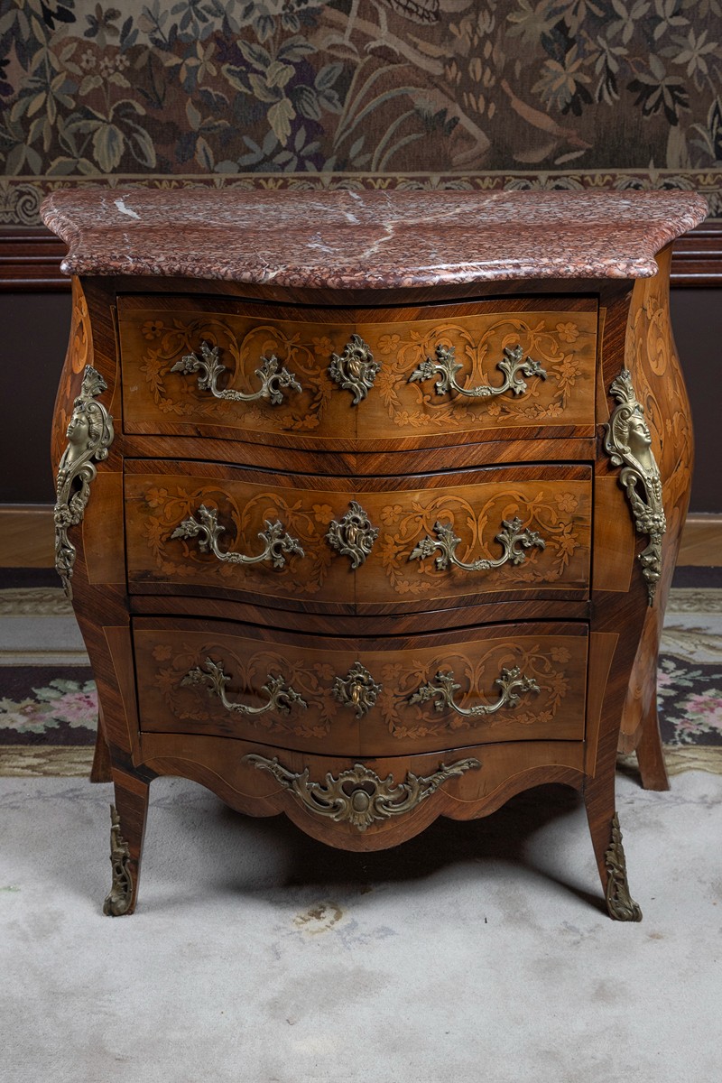 20. století, Francie, dřevo, palisandrová dýha, intarzováno exotickými dýhami, motivy rozvilin, čtyři esovité nohy, tři zásuvky, bohatě zdobeno bronzovými aplikami, vrcní deska růžový žilkovaný mramor