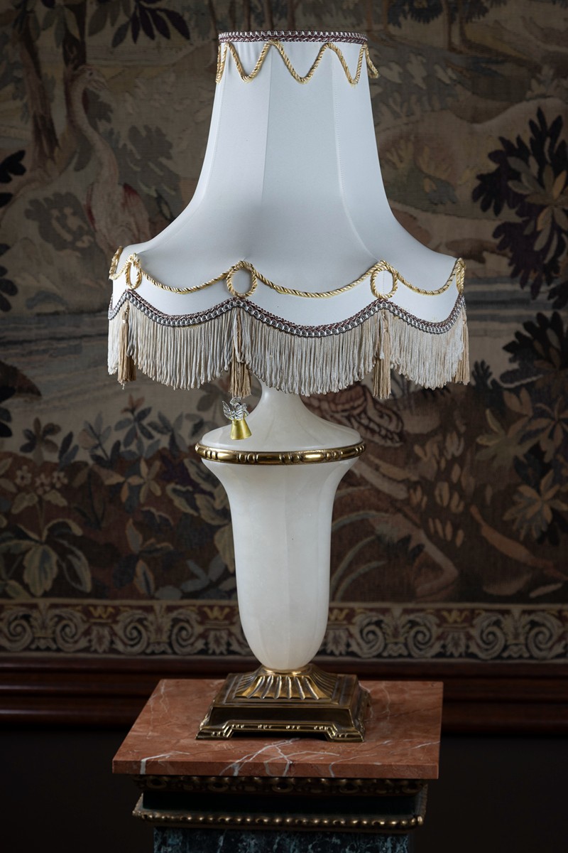 novodobé, alabastrová noha ve tvaru vázy, základna bronzová, látkové stínítko, elektrifikováno, bez záruky funkčnosti