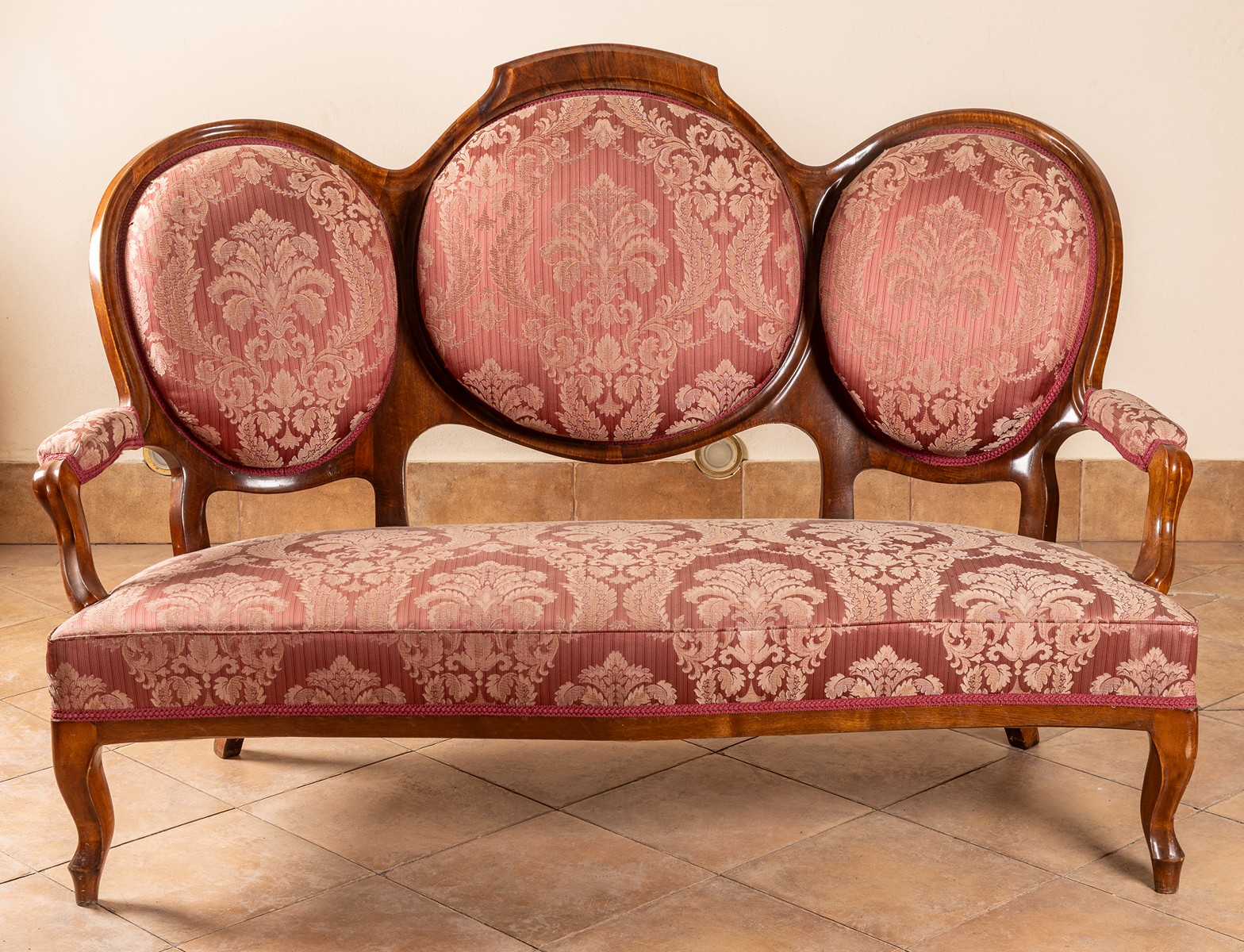 2. pol. 19. století, Čechy, ořechové dřevo, sedák, područky a opěradlo čalouněné vínovým brokátem