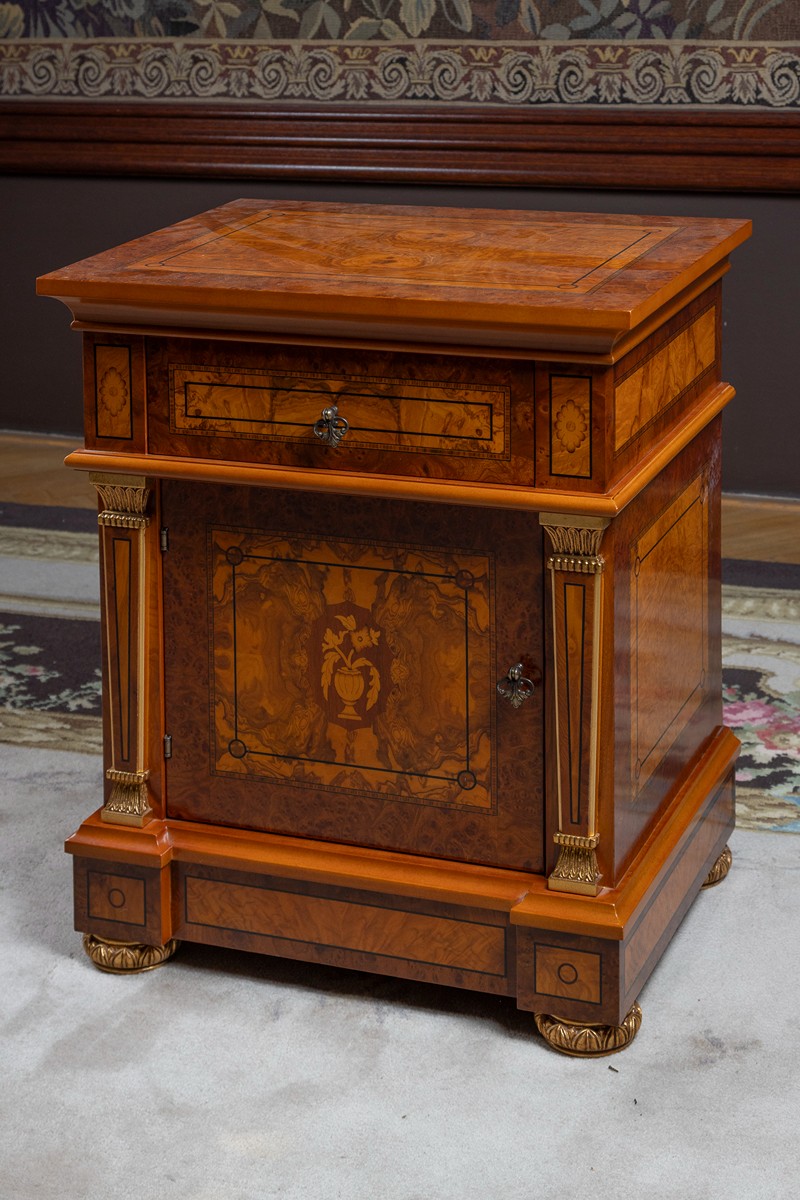 novodobé, dřevo, dýhováno exotickými dřevy, intarzováno, mosazné apliky, obsahuje skříňku a jednu zásuvku