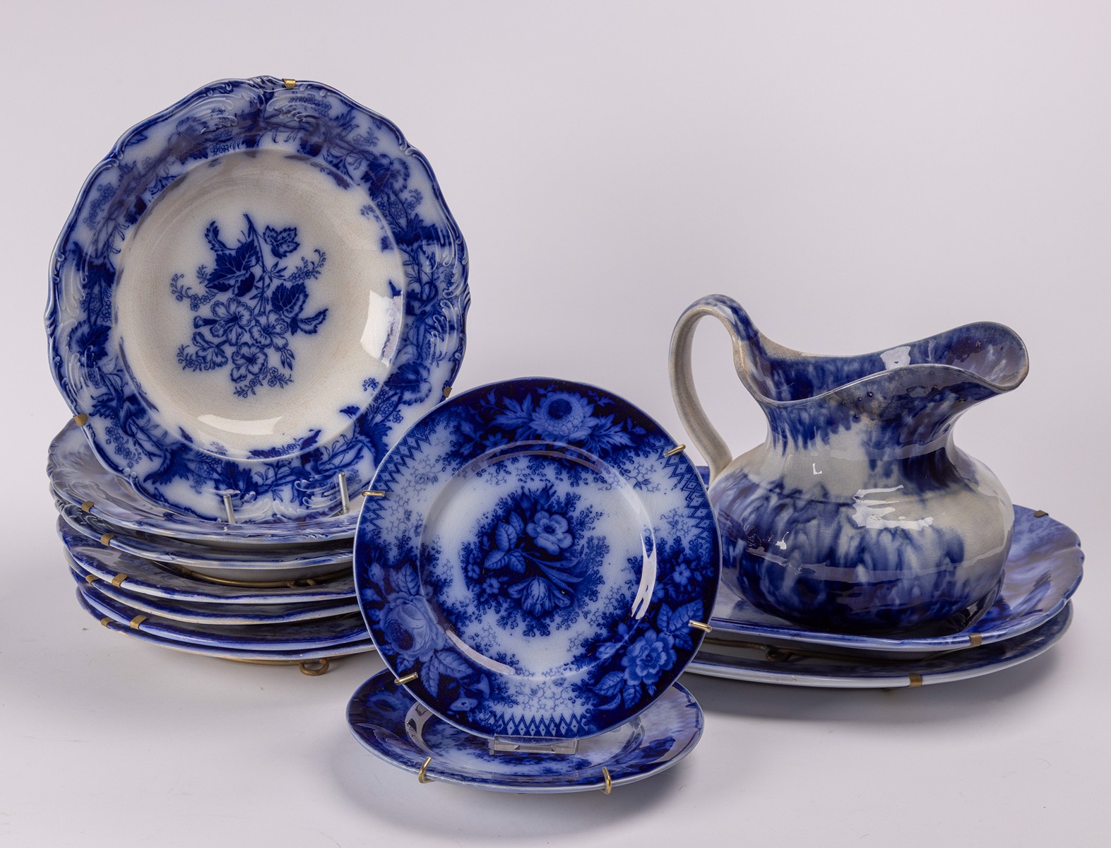 2. pol. 19. století, Stará Role, 12 kusů, keramika, glazovaná, modrý tištěný dekor, obsahuje 4 hluboké, 3 mělké a 2 desertní talíře, džbánek a 2 mísy
