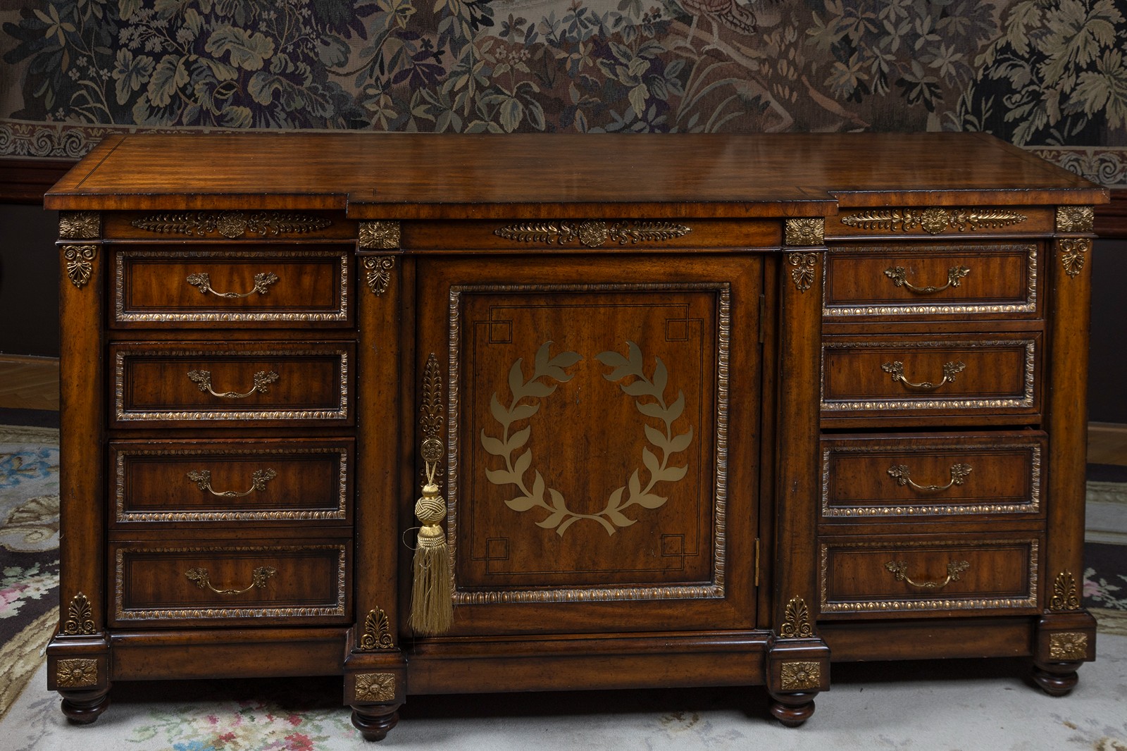 novodobé, dřevo, ořechová dýha, zlaceno, uprostřed mosazí intarzovaný vavřínový věnec, po strannách zásuvky, uprostřed skříňka